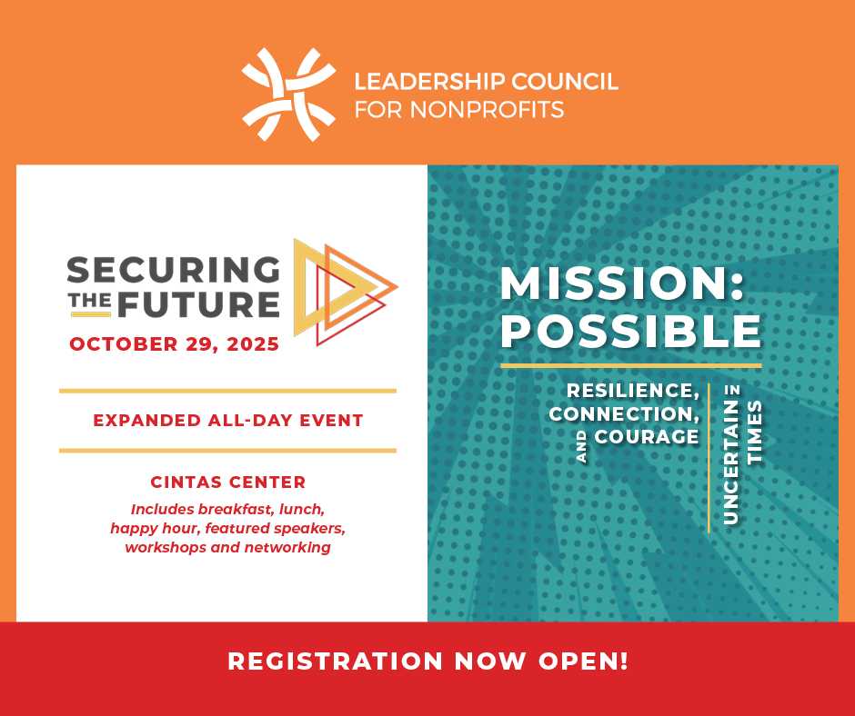 25th Annual Securing the Future Conference, (Oct. 29, 8 am-5:00 pm), annual conference hosted by Leadership Council for Nonprofits. EXPANDED full-day nonprofit conference with featured speakers Suzanne Smith, Social Impact Architects, and Patrice Borders, AmplifyEI. Workshops, exhibitor fair, and networking. Registration $150-200 includes breakfast, lunch, happy hour. Learn more and register here.