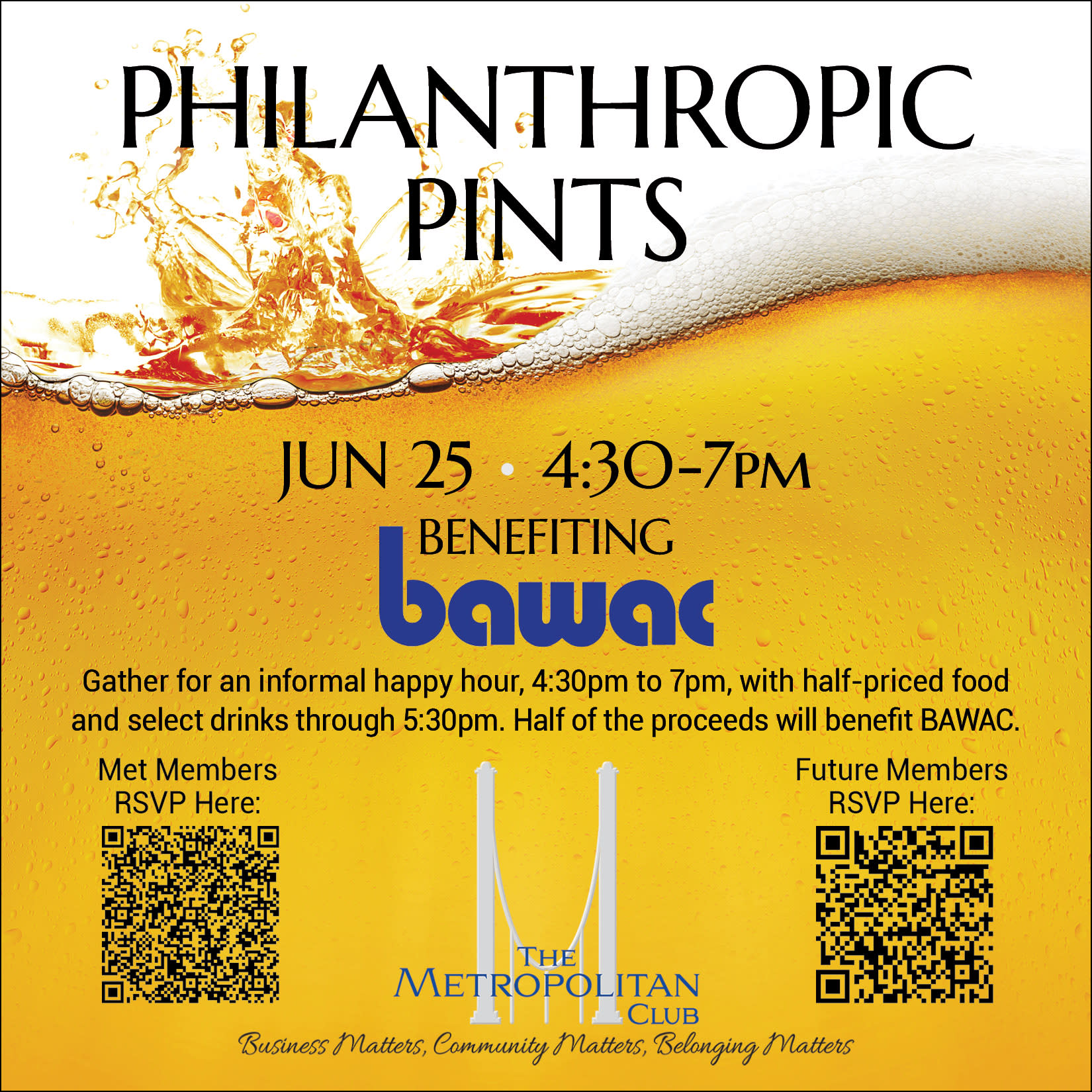 DESCRIPTION:𝐂𝐨𝐦𝐞 𝐭𝐡𝐢𝐫𝐬𝐭𝐲 𝐚𝐧𝐝 𝐛𝐫𝐢𝐧𝐠 𝐲𝐨𝐮𝐫 𝐚𝐩𝐩𝐞𝐭𝐢𝐭𝐞!You are cordially invited to join us at The Metropolitan Club in Covington on Tuesday\, June 25th from 4:30p -7:00p for our first Philanthropic Pints event.  Meet and socialize with the BAWAC leadership team and Board of Directors and learn how BAWAC is changing lives through Employment and Life Skills training\, Production & Industrial services\, Transportation\, Supported Employment\, and more!  Enjoy your favorite beverage with hors d'oeuvres\, or choose from a variety of sandwiches and salads.  Half of all proceeds from food and drink purchases will support BAWAC programs and services.  We'll see you at the Met!*𝐇𝐚𝐥𝐟-𝐩𝐫𝐢𝐜𝐞𝐝 𝐝𝐫𝐢𝐧𝐤𝐬 𝐚𝐧𝐝 𝐚𝐩𝐩𝐞𝐭𝐢𝐳𝐞𝐫𝐬 𝐟𝐫𝐨𝐦 𝟒:𝟑𝟎𝐩 - 𝟓:𝟑𝟎𝐩 𝐟𝐨𝐫 𝐇𝐚𝐩𝐩𝐲 𝐇𝐨𝐮𝐫*